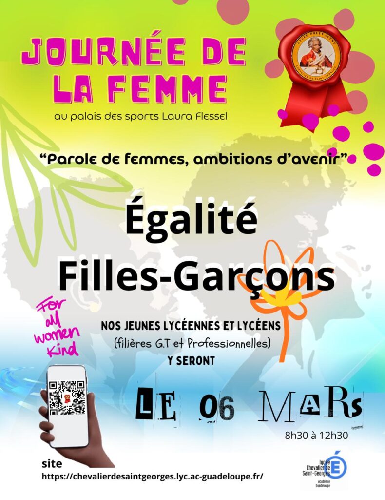 Les élèves du lycée CHEVALIER DE SAINT-GEORGES, des filières générales et professionnelles, prendront part à ce temps fort au Palais des Sports Laura FLESSEL en Guadeloupe, pour faire raisonner la parole des femmes et nourrir les ambitions d’avenir.