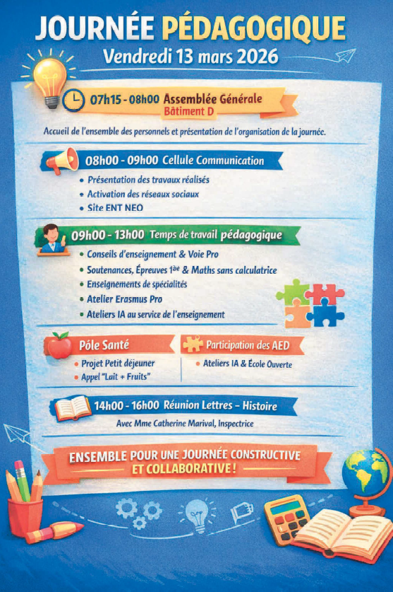 JOURNÉE PÉDAGOGIQUE 11 mars 202611 mars 2026 Lycée polyvalent CHEVALIER DE SAINT-GEORGES - BAIMBRIDGE 2 (EX CARAIBES)